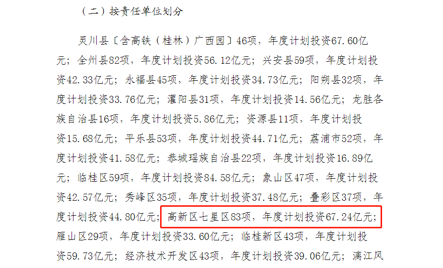 從投資劃分來看,桂林“富人區(qū)”高新七星區(qū),2020年重大項目83項,年度計劃投資67.24億元。