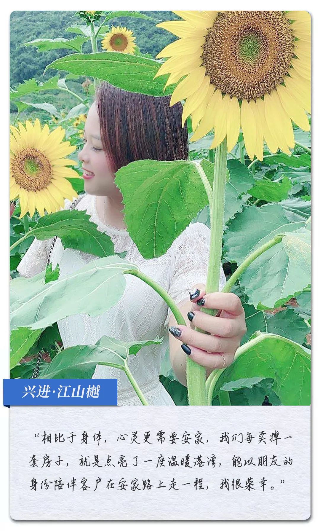 很多像李微微、張藍(lán)之、于澤坤一樣的安家顧問,在他們看來(lái),賣的是房子,肩負(fù)的卻是家,他們也正用自己的方式,努力成為客戶的理想生活規(guī)劃師,為還在尋覓幸福的人找到家。