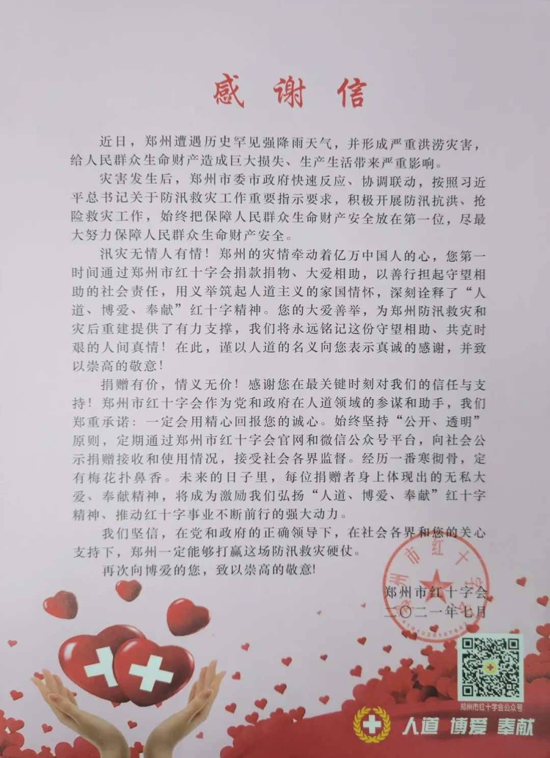 今年夏天,河南發(fā)生罕見洪災(zāi),多地抗洪救災(zāi)形勢十分嚴(yán)峻。為了幫助河南人民渡過難關(guān),興進(jìn)集團(tuán)通過鄭州市紅十字會向?yàn)?zāi)區(qū)捐贈50萬元善款,以實(shí)際行動為受災(zāi)群眾、抗洪一線的救援人員提供支持。