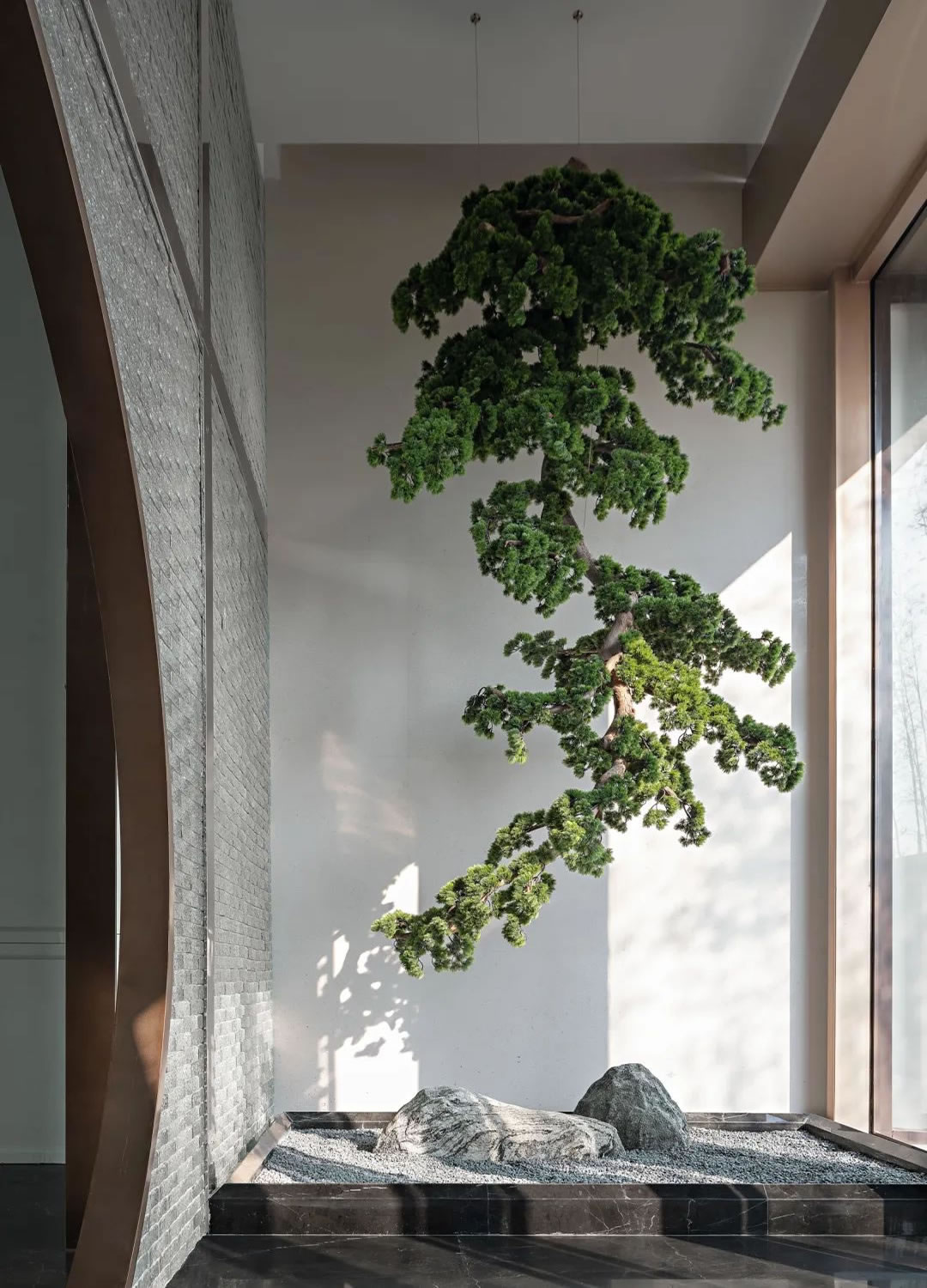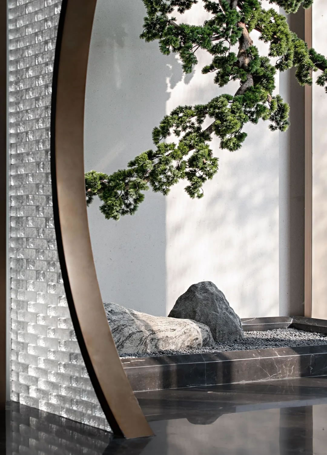 電梯廳·游園丨比起快節(jié)奏里的繁華似錦,方正與圓融塑造的空間意境,更充滿無限的意趣,隨性的倒掛松柏,鋪陳的禪石置景,讓移步的樂趣同樣擁有著靜謐的靈動,層層遞進,抵達至極的從容。
