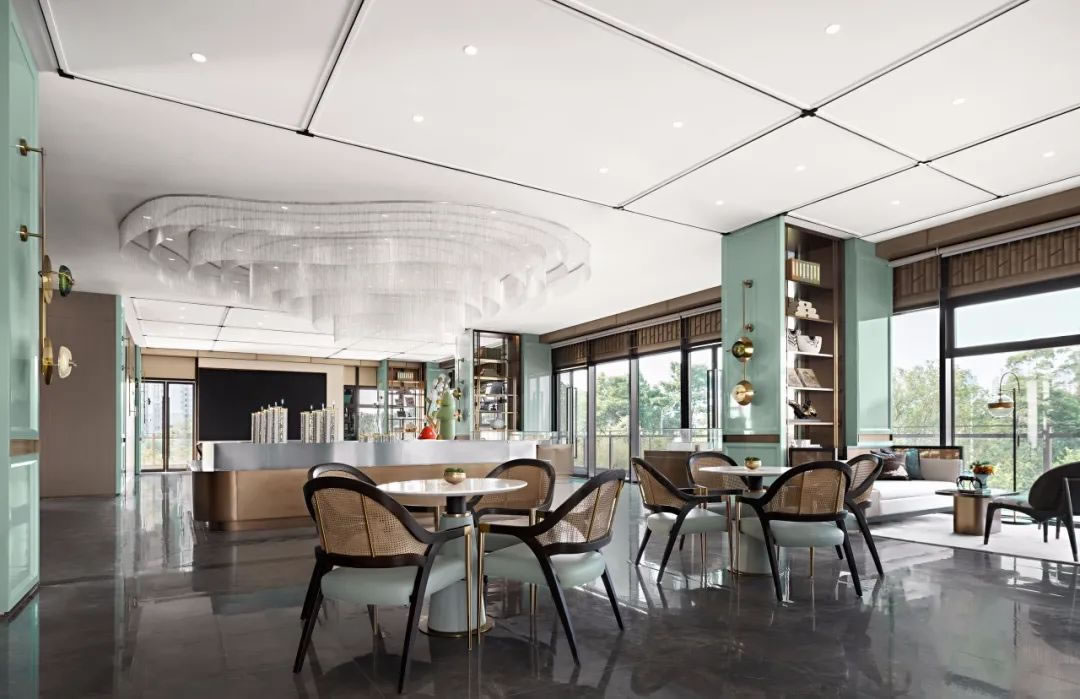 沙盤區(qū)丨石綠的鮮明色彩流變在整個氛圍之中,將色彩的風骨韻味與美學的極簡形態(tài)融為一體,在整體的明朗開闊布局之下,通過鎏金與浮白的挑染,讓這個區(qū)域里人與人的溝通擁有著"和"的氣息。