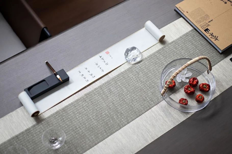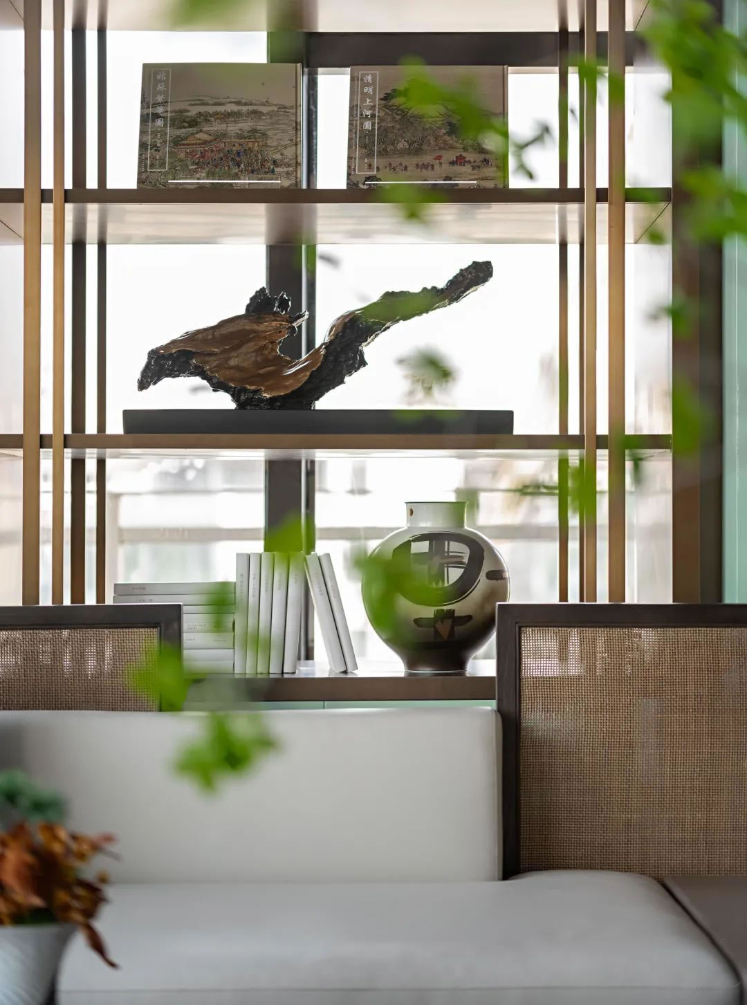 洽談區(qū)丨形與意的平衡,在于"去符號化",無需傳統(tǒng)的繁復(fù)細節(jié),只要落座其中,就能將東方美學的輪廓和意境逐一闡述,木雕、書柵、蘭草,每一種靜物都像是一種韻,讓溝通在審美的蔓延下更加暢通無阻。
