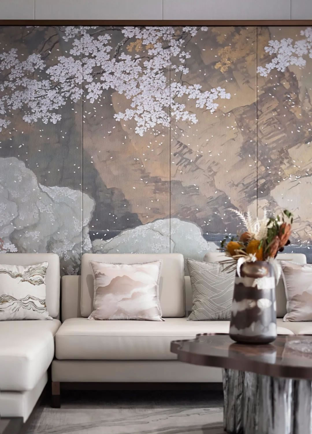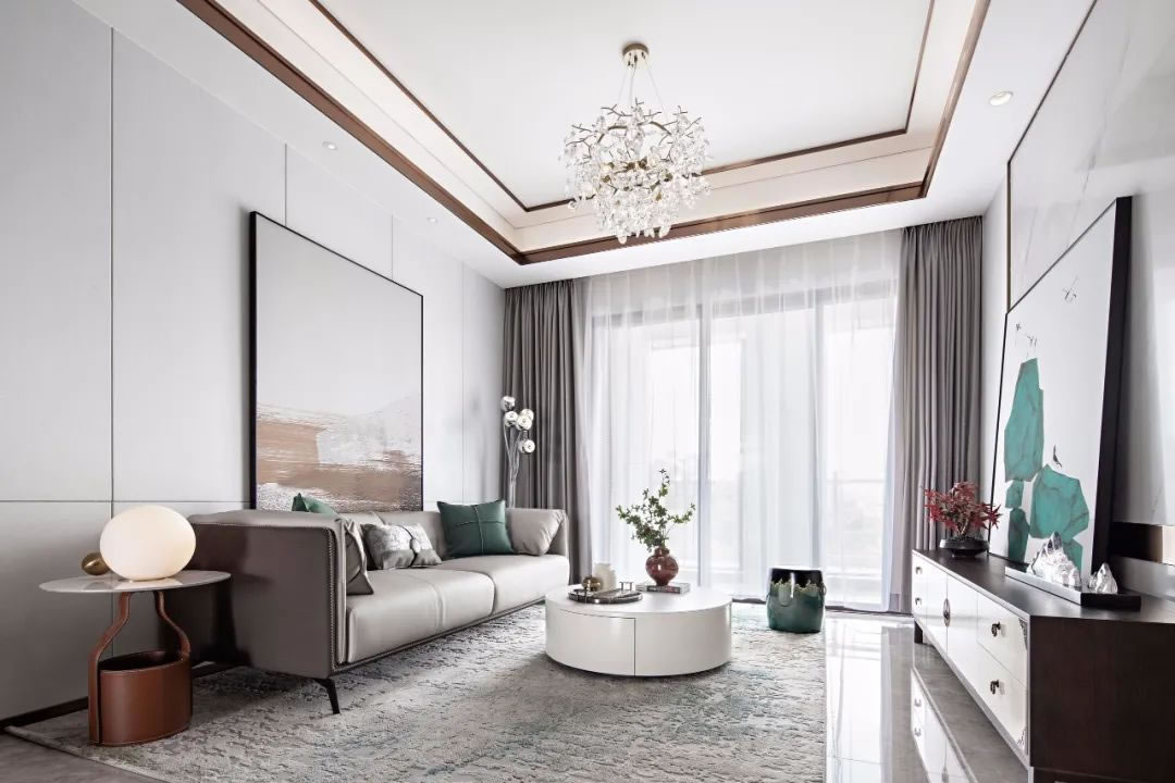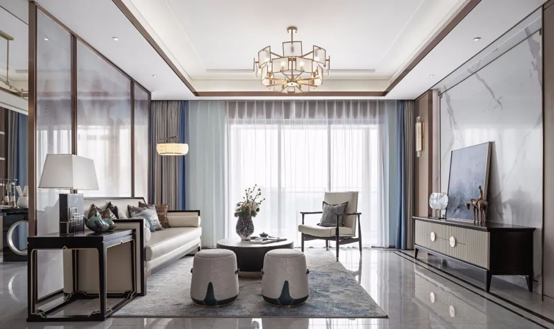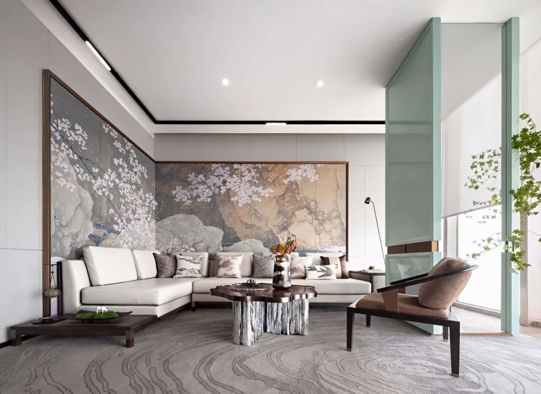 客廳丨東方美學的空間語言更在于一種體驗式的感受,情緒如果它的精神特質(zhì),在規(guī)整的布局,落地的光影,素雅的色彩,細節(jié)的紋理中都能呼之欲出,讓視覺的思維可以毫無阻礙的,架構(gòu)出一副落筆成軸的畫卷,澄凈通透,美不勝收。