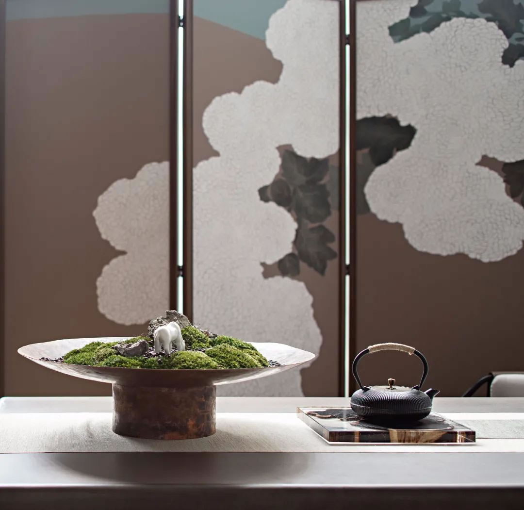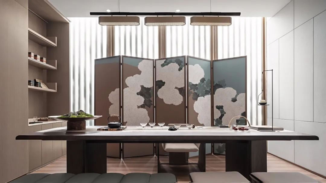 用充滿古風意蘊的屏風作為載體,讓茶室的小酌多了些許怡然情趣,方正的格局搭配著古雅的色調(diào),有著未經(jīng)雕琢的簡約之美,靜心、靜神、靜己。