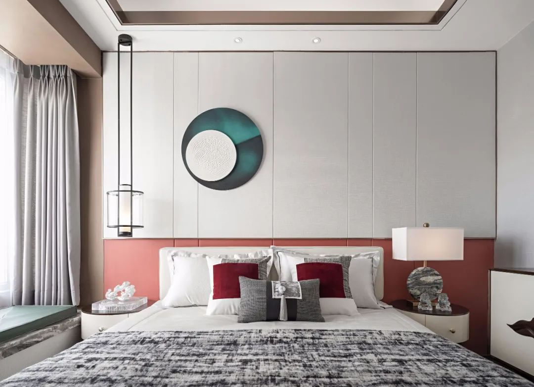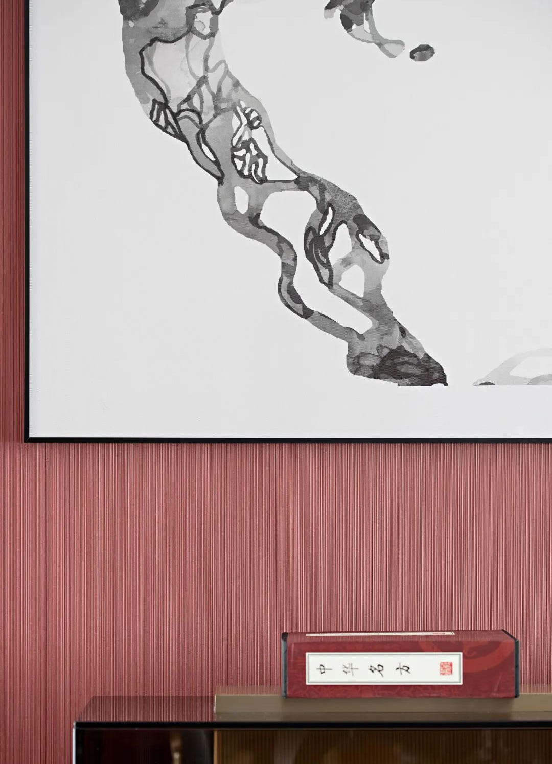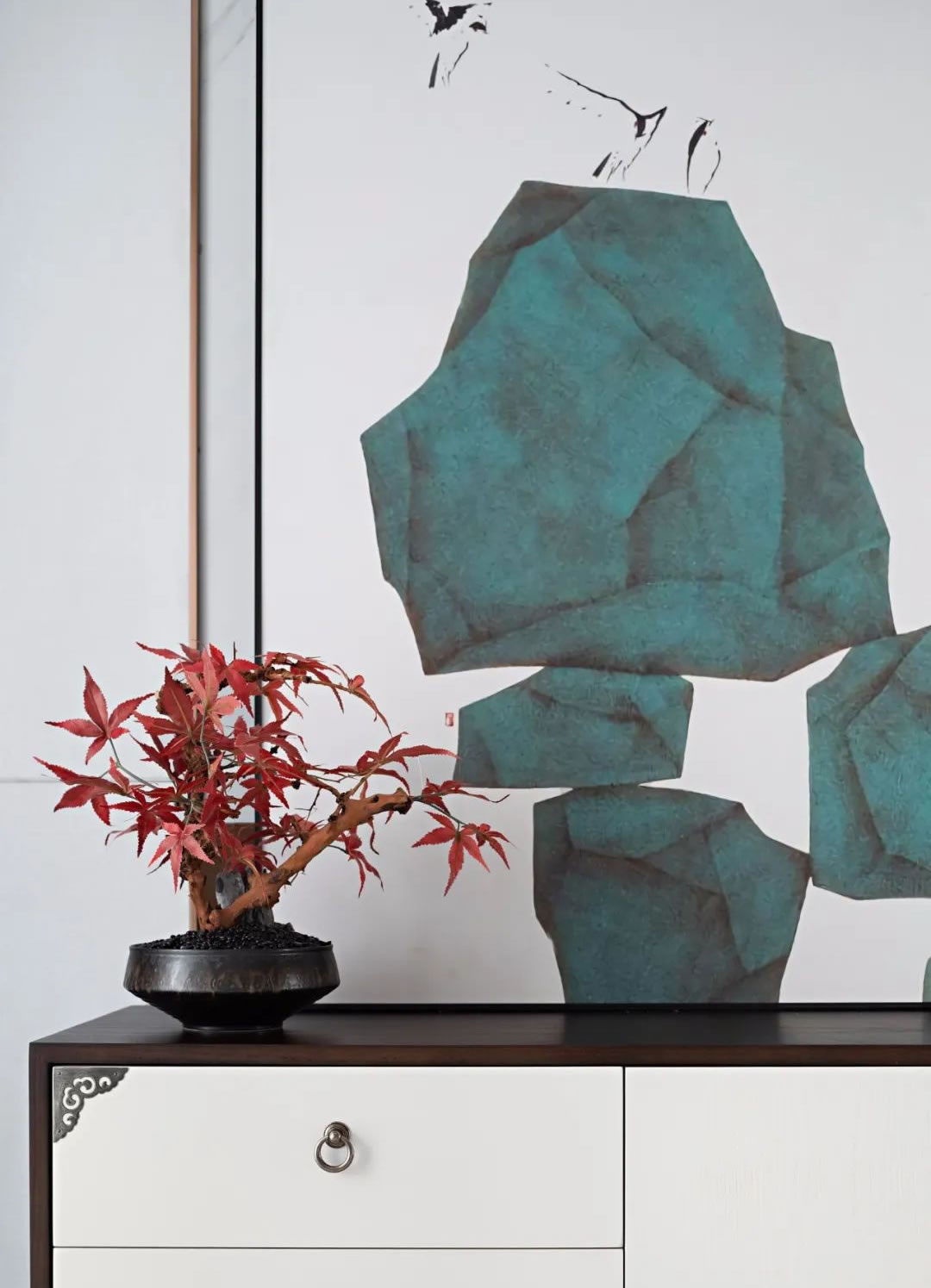 臥室丨朱砂紅的色彩格局在主臥的視野中蔓延開來,而松石綠如同點睛之筆,將場景暈染出情緒色彩,床頭那一尾禪靜的壘石,柜面那一抹楓葉的彩染,窗欞那一場愜意的品茗,或靜或動,或定或閑,讓生活既是景中畫,也是畫中景。