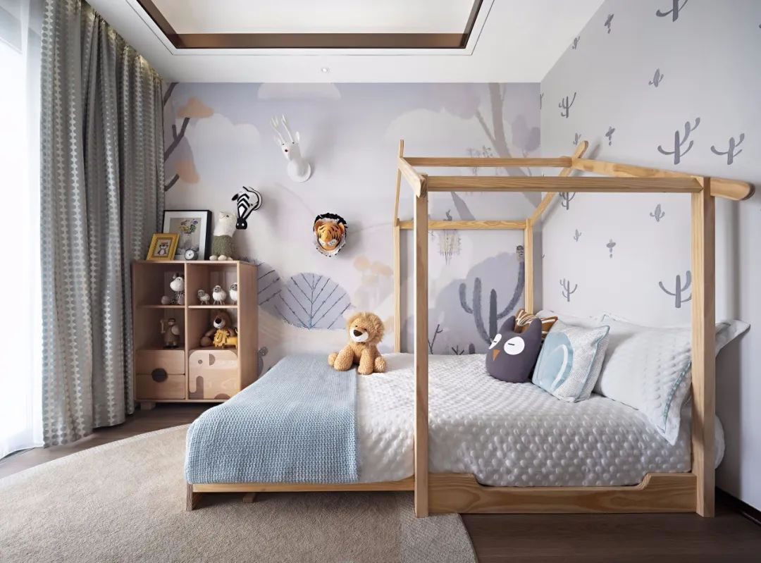 兒童房丨墻體的彩繪讓想象肆意蔓延,原木的搭建讓空間舒適生長,多種動物元素的場景搭配都陪伴著小主人的成長故事,窗幾落地的璀璨光影,為所有天馬行空的想象力創(chuàng)造舒適的記憶。