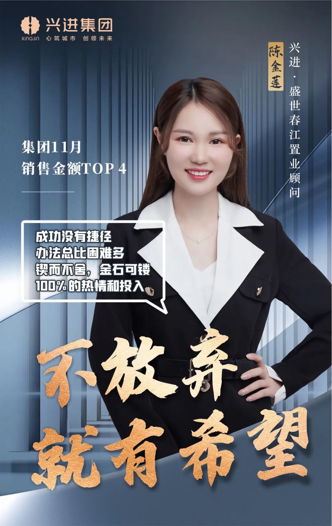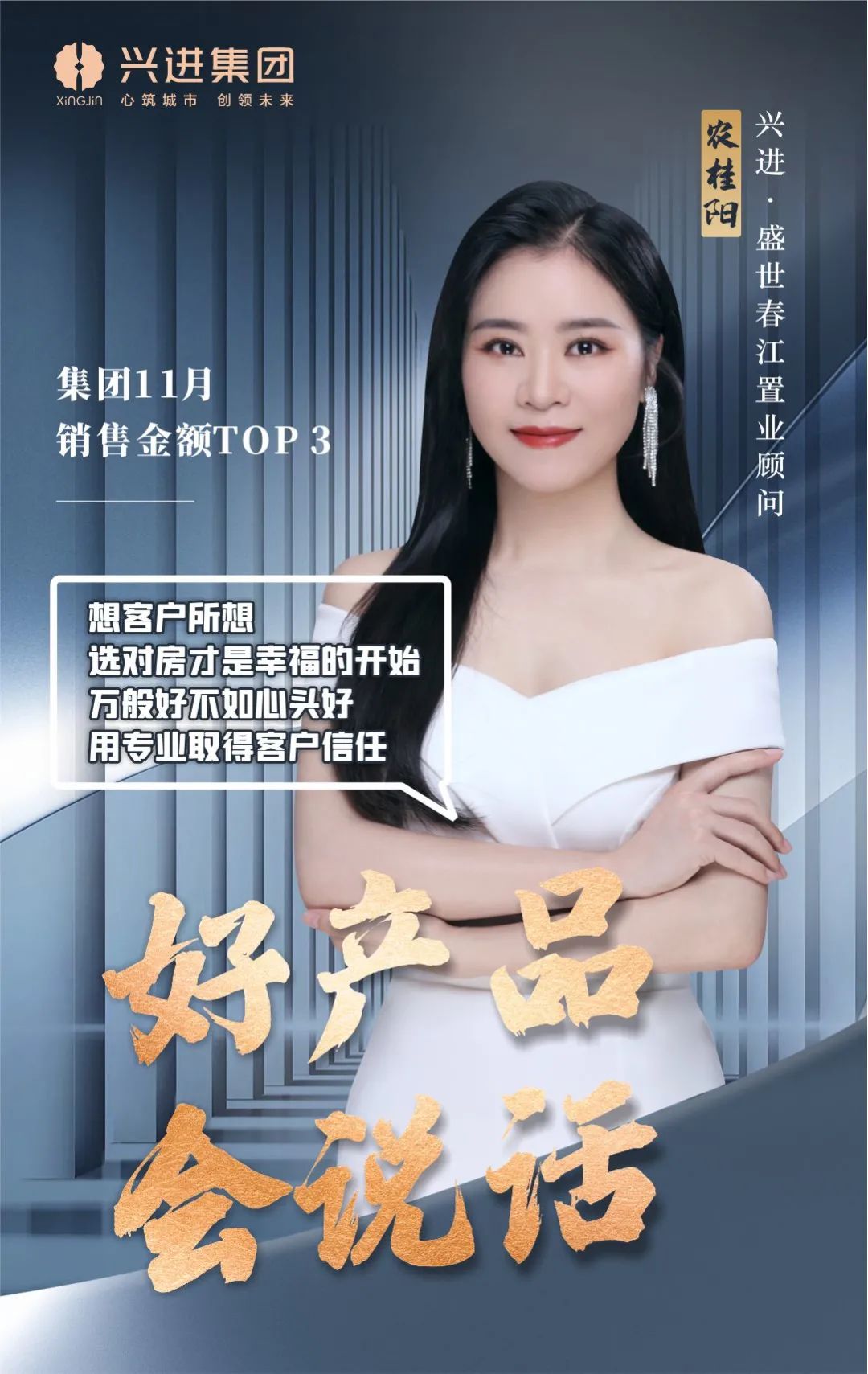 興進(jìn)·盛世春江營銷團(tuán)隊,11月獲得集團(tuán)優(yōu)秀團(tuán)隊殊榮,集團(tuán)銷售金額前5名均為團(tuán)隊成員,他們用專業(yè)與溫情,成為客戶的美好生活規(guī)劃師。