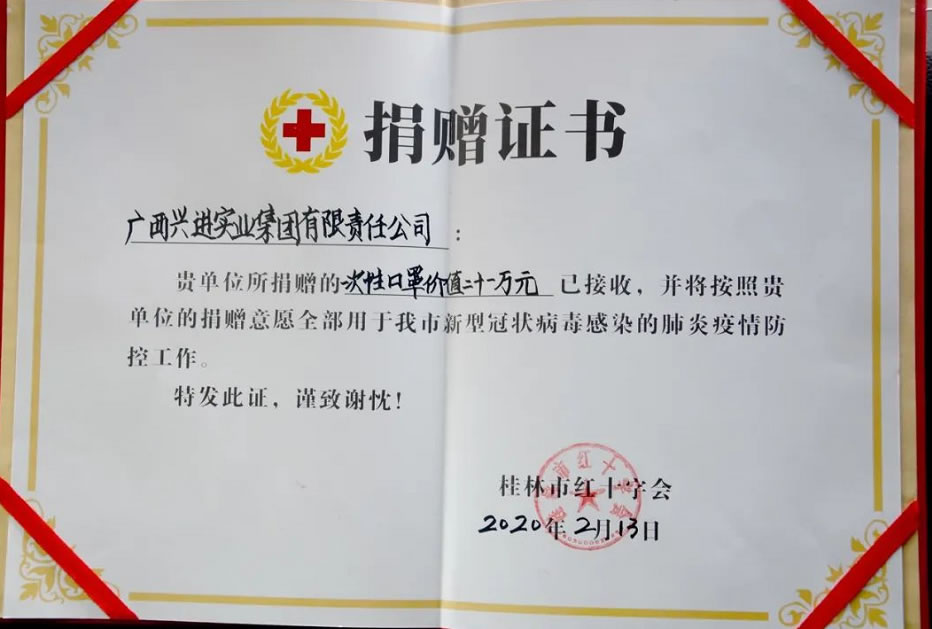 2020年,疫情肆虐的一年,興進集團第一時間啟動應急捐贈,向武漢市江夏區(qū)紅十字會、桂林市第二人民醫(yī)院、自治區(qū)南溪山醫(yī)院、桂林市紅十字會等15家抗疫一線單位,捐助抗疫善款及醫(yī)療物資,總金額超168萬元,用鐵肩擔當、愛心善舉助力疫情防控。