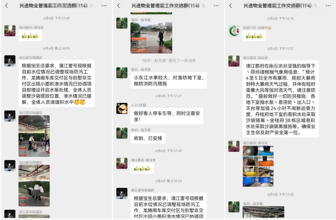 小區(qū)時刻監(jiān)控市政路面及車庫積水情況,若有內(nèi)澇風(fēng)險提前聯(lián)系業(yè)主挪車,并做好了使用拖車為在外業(yè)主挪車的準備。巡查過程中發(fā)現(xiàn)某業(yè)主凌晨在外工作,家中車輛不能及時挪動,物業(yè)人員了解到情況后,4點冒著大雨驅(qū)車前往業(yè)主辦公單位拿車鑰匙,為業(yè)主愛車挪至安全區(qū)域,這一舉措獲得了興進業(yè)主一致認可,最終確保了小區(qū)車輛0損失,0泡水。