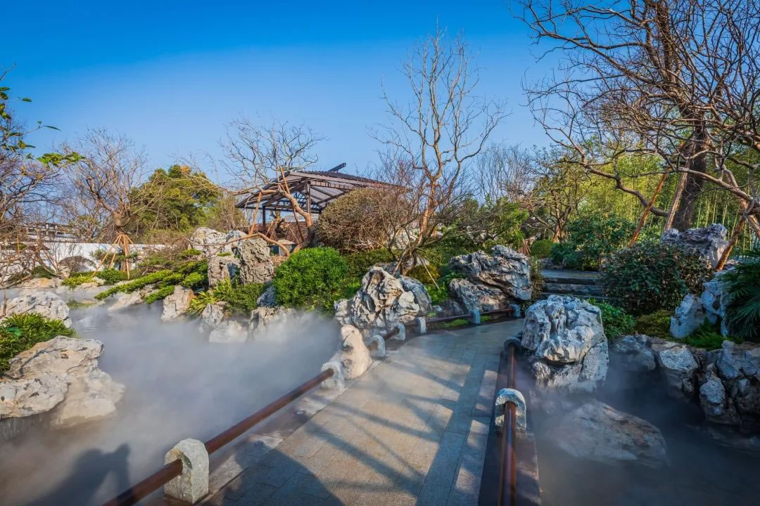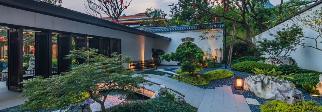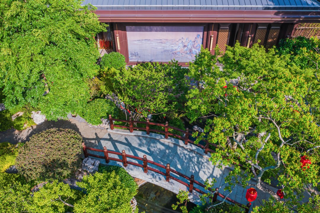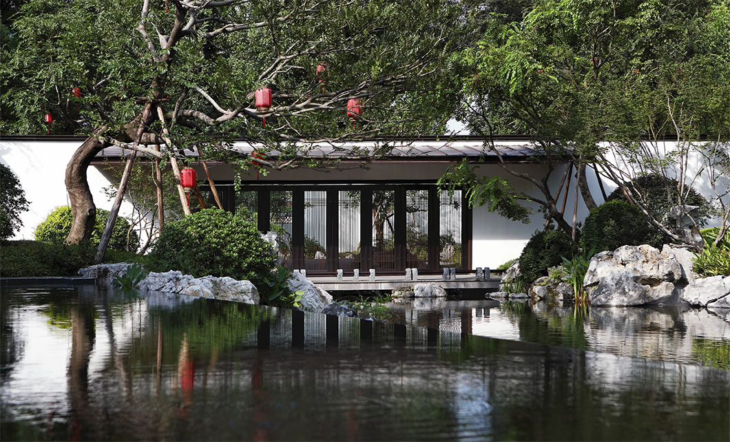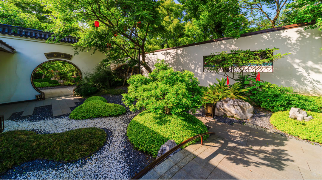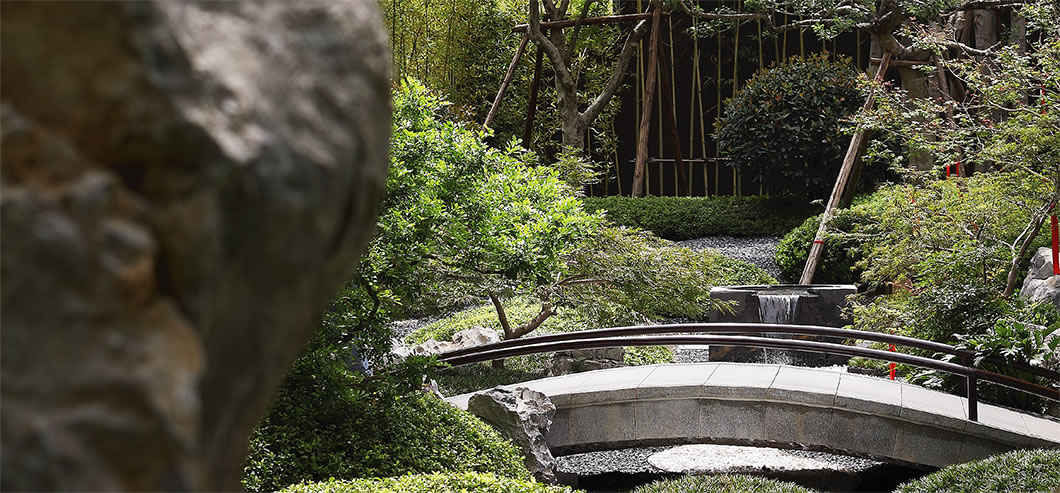 園林設(shè)計在傳承中國蘇州園林經(jīng)典和嚴(yán)肅規(guī)制的同時日本枯山水意境、精心考究照壁、水池、亭臺等元素,做到動靜相合、高地相輔、遠(yuǎn)近融通。