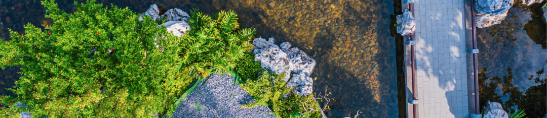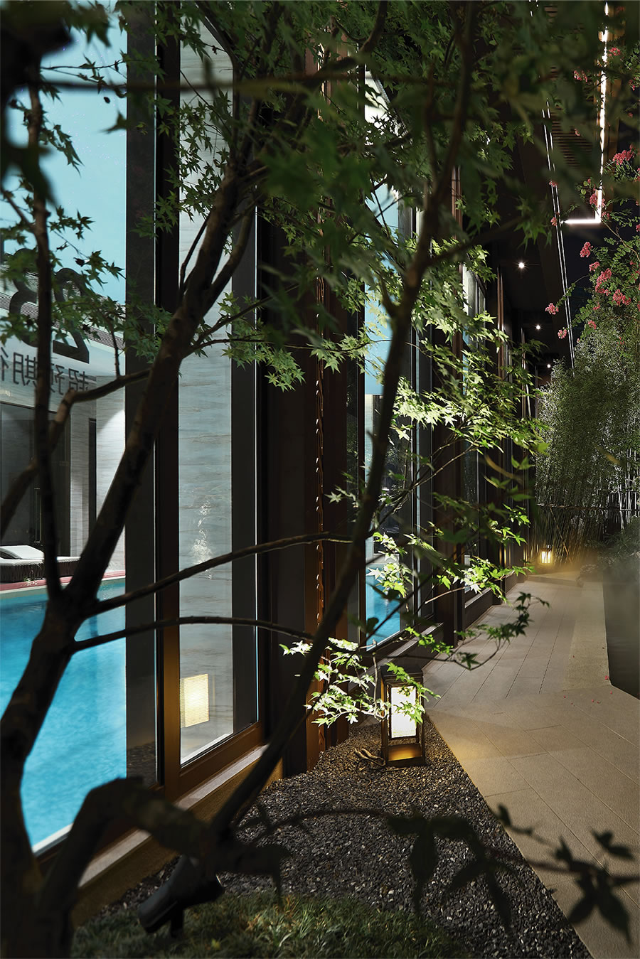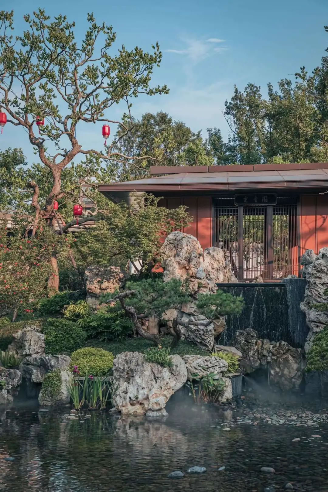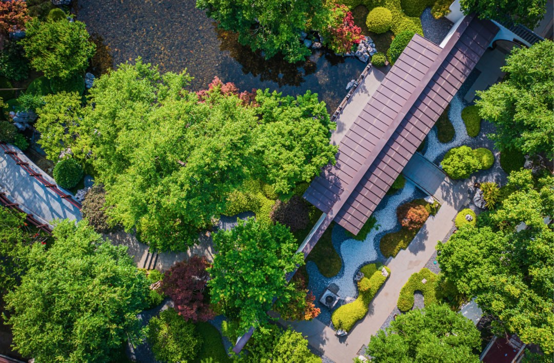 園林設(shè)計在傳承中國蘇州園林經(jīng)典和嚴(yán)肅規(guī)制的同時日本枯山水意境、精心考究照壁、水池、亭臺等元素,做到動靜相合、高地相輔、遠(yuǎn)近融通。