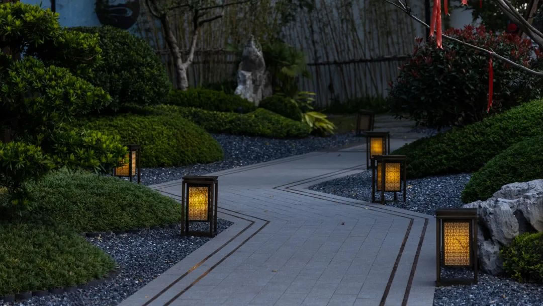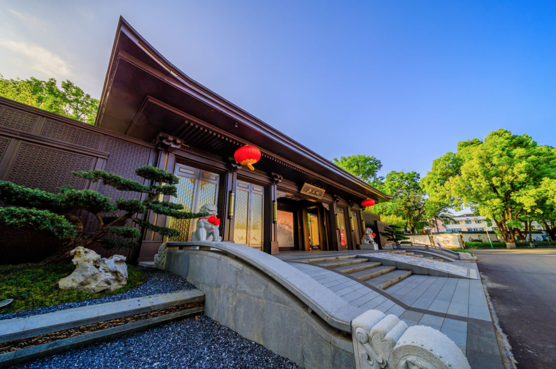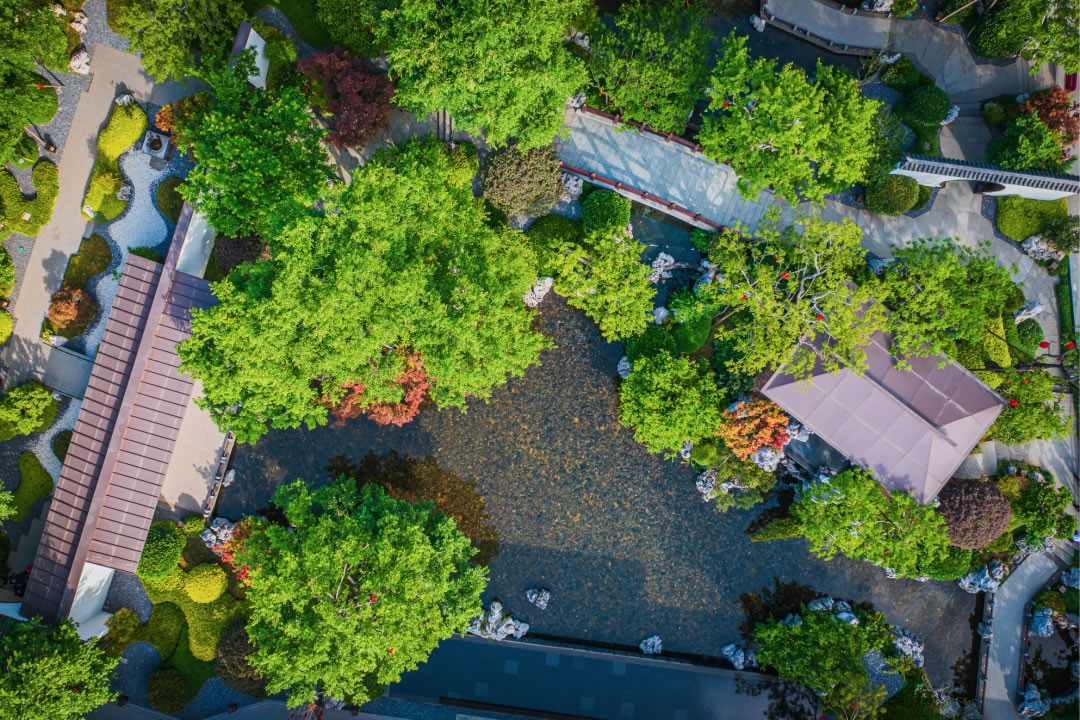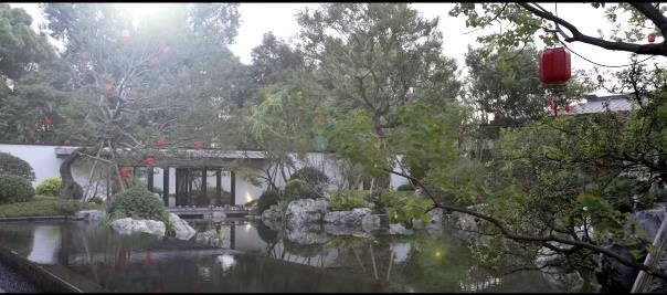 園林設計在傳承中國蘇州園林經(jīng)典和嚴肅規(guī)制的同時融入日本枯山水意境、精心考究照壁、水池、亭臺等元素,做到動靜相合、高地相輔、遠近融通。