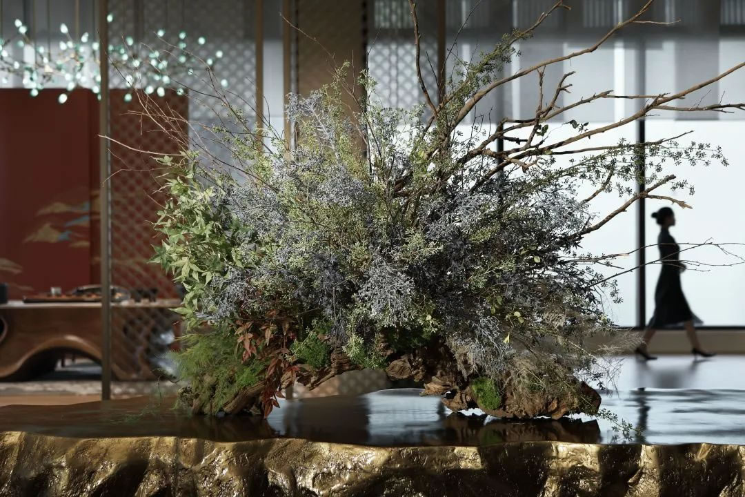 同時地面折射出空間的倒景,將空間內拔萃的竹林畫像、日耀山影以及金屬元素,共匯于一界之間。